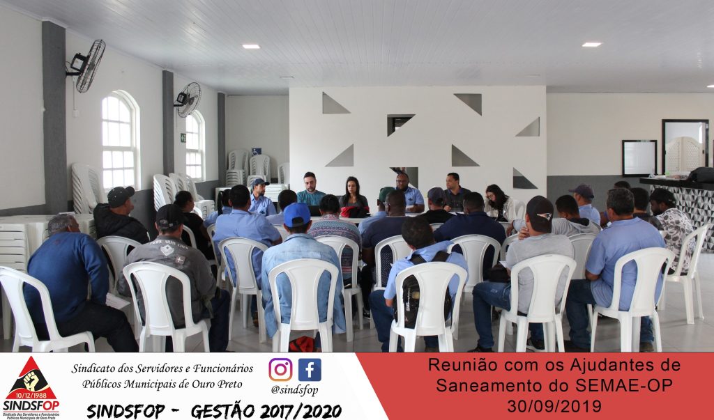 Ontem, 30/09/2019, na sede do SINDSFOP, o grupo de trabalho sobre o enquadramento dos servidores do SEMAE-OP deu continuidade em suas atividades. Na parte da manhã, foram analisadas as situações e demandas dos servidores da categoria dos Operadores de Estação de Tratamento de Água e Esgoto e, na parte da tarde, foi realizada a segunda […]