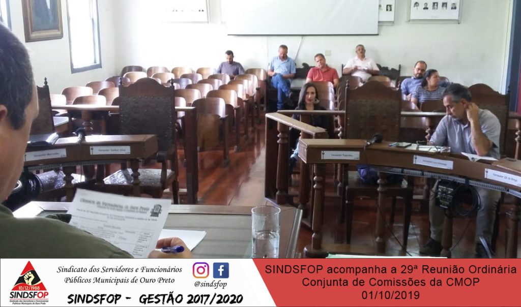 A diretoria do SINDSFOP, no dia 01/10/2019, acompanhou a 29ª Reunião Ordinária Conjunta de Comissões da Câmara Municipal de Ouro Preto e defendeu os interesses dos servidores na discussão dos projetos de lei que estavam em pauta. Todas as terças-feiras, a direção do SINDSFOP participa das Reuniões Conjuntas de Comissões da Câmara Municipal de Ouro […]